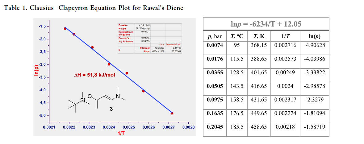 然而,蒸馏是实验室向工业化放大的关键瓶颈,其效率高度依赖蒸气压数据。作者测定Rawal’s二烯的蒸气压-温度关系(Table 1):在95–185 °C范围内,ln p 与 1/T 呈良好线性,对应汽化焓51.8 kJ/mol——与2-丙二醇(52.4)、二甘醇甲醚(51.9)和苄胺(51.8)相近。该温压区间完全适配半工业减压蒸馏;更高压力(>0.2 bar)下线性偏离,提示潜在热分解,故放大时须严格控压。