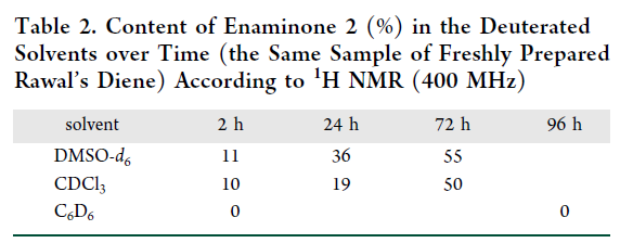 接下来,作者开发分析方法来对其质量进行研究。由于色谱法(LC-MS、GC-MS)因该化合物热/化学不稳定性而失效。我们转而采用¹H NMR法(Table 2),并系统筛选氘代溶剂: