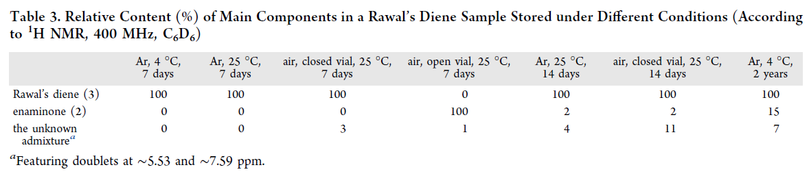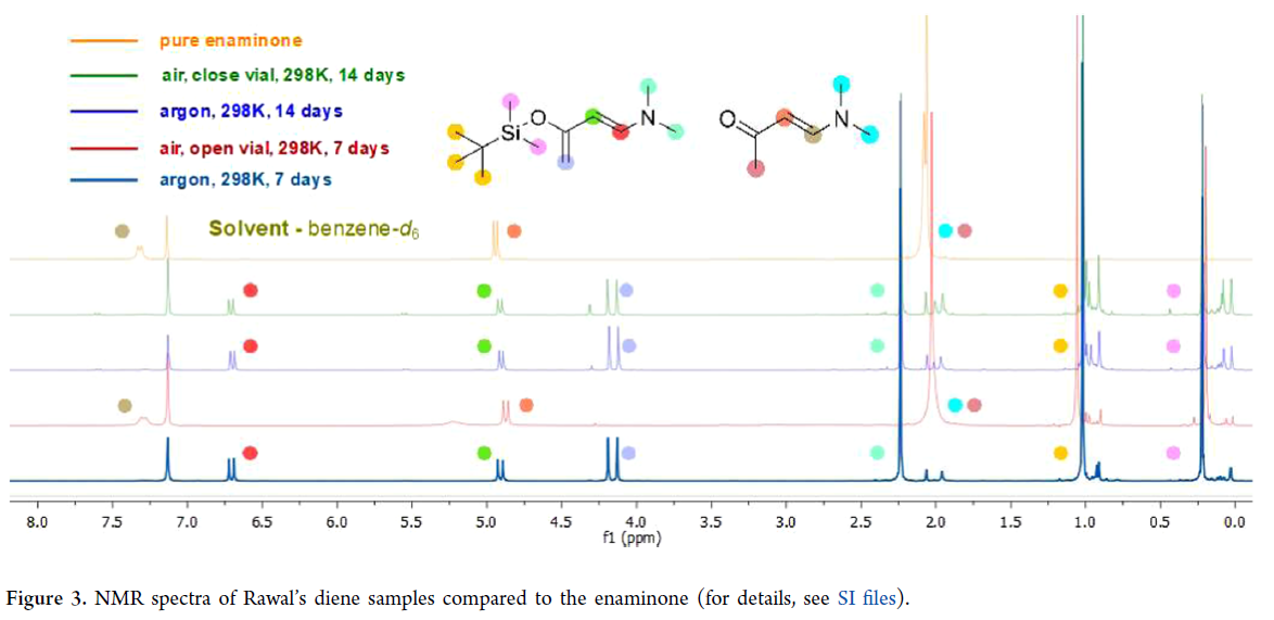随后,作者评估了Rawal’s二烯的储存稳定性(Table 3)。即1)敞口储存(7天):迅速吸湿水解,主产物为烯胺酮2,完全不可行;2) 密封储存(7天):空气或氩气氛围下(4–25 °C),纯度基本不变;但空气样品出现3%未知杂质(δ 5.53/7.59 ppm双峰,非水解产物),且颜色由淡黄→橙→棕(Figure 2);3)密封储存(14天):空气样品杂质升至11%,氩气样品为4%;杂质源于氧气缓慢氧化(痕量O₂亦可引发),但不影响后续杂Diels–Alder反应活性;烯胺酮生成则提示商用氩气含残留水分,须严格纯化;4)长期储存(2年,4 °C/Ar):CDCl₃中¹H NMR显示纯度保持83%,证实该条件可行。