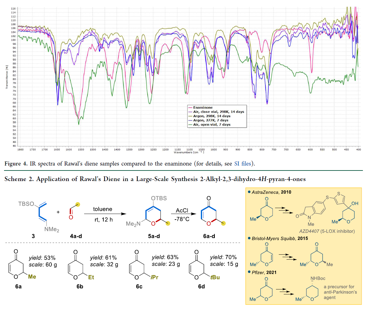 本工作系统突破了拉瓦尔二烯规模化应用的长期瓶颈:1)合成:建立可放大的稳定制备工艺,单批最高得520 g二烯,总收率57%,兼具高重现性与半工业化适配性;2)储存:对水/氧敏感,需惰性气氛+低温长期保存;但短期(数日)可于室温密封或氩气下稳定存放,质量无明显下降;3)分析:确立¹H NMR(C₆D₆为溶剂)与IR联用的质量控制标准——C₆D₆避免分析中降解,IR可快速识别杂质(如1580 cm⁻¹峰指示氧化副产物);4)应用:成功实现四类2-烷基吡喃酮(6a–d)的克级合成,反应条件温和、纯化简便(仅柱层析),直接支撑药物化学与工艺开发需求。