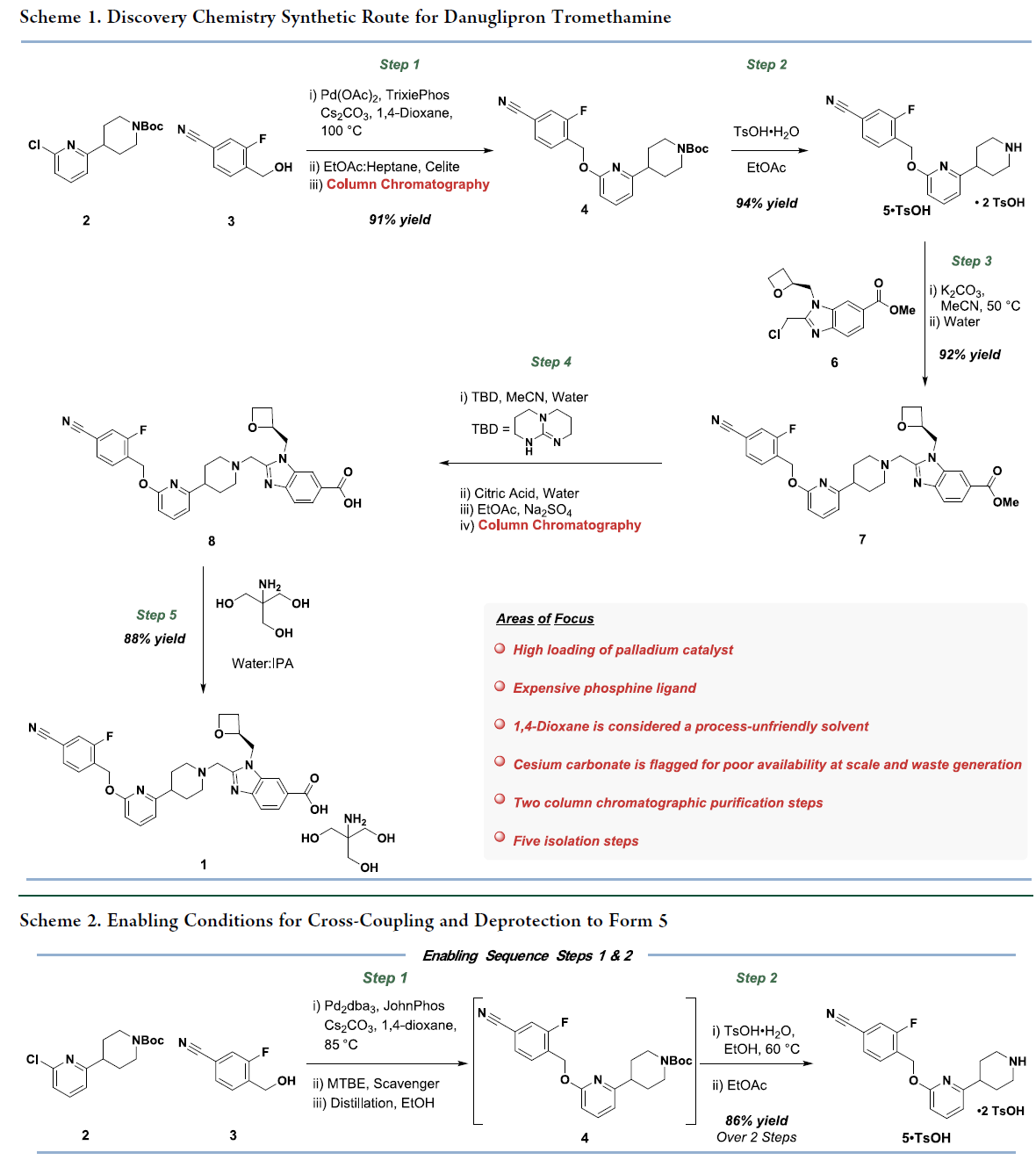 Danuglipron的合成方法,如scheme 1所示。即2与3经钯催化C–O偶联获得4,4脱保护得二对甲苯磺酸盐5。随后,5在碱性条件下与含氧杂环丁烷的氯甲基苯并咪唑6发生烷基化,生成酯7。最后,7经TBD介导水解得中间体8,再与三羟甲基氨基甲烷(tromethamine)成盐,得到Danuglipron(1)。该路线虽成功支持临床前供药,但存在明显工艺瓶颈:步骤1钯用量高(5 mol%),且全程需两次柱层析纯化。鉴于danuglipron具有重大临床与商业化潜力,亟需建立低成本、稳健、高效、可持续的商业化生产工艺。基于此,Pfizer的科学家聚焦于步骤1与步骤2的串联工艺开发——即从2和3直接高效制备中间体5,实现无色谱、低金属残留、高收率的连续化操作。