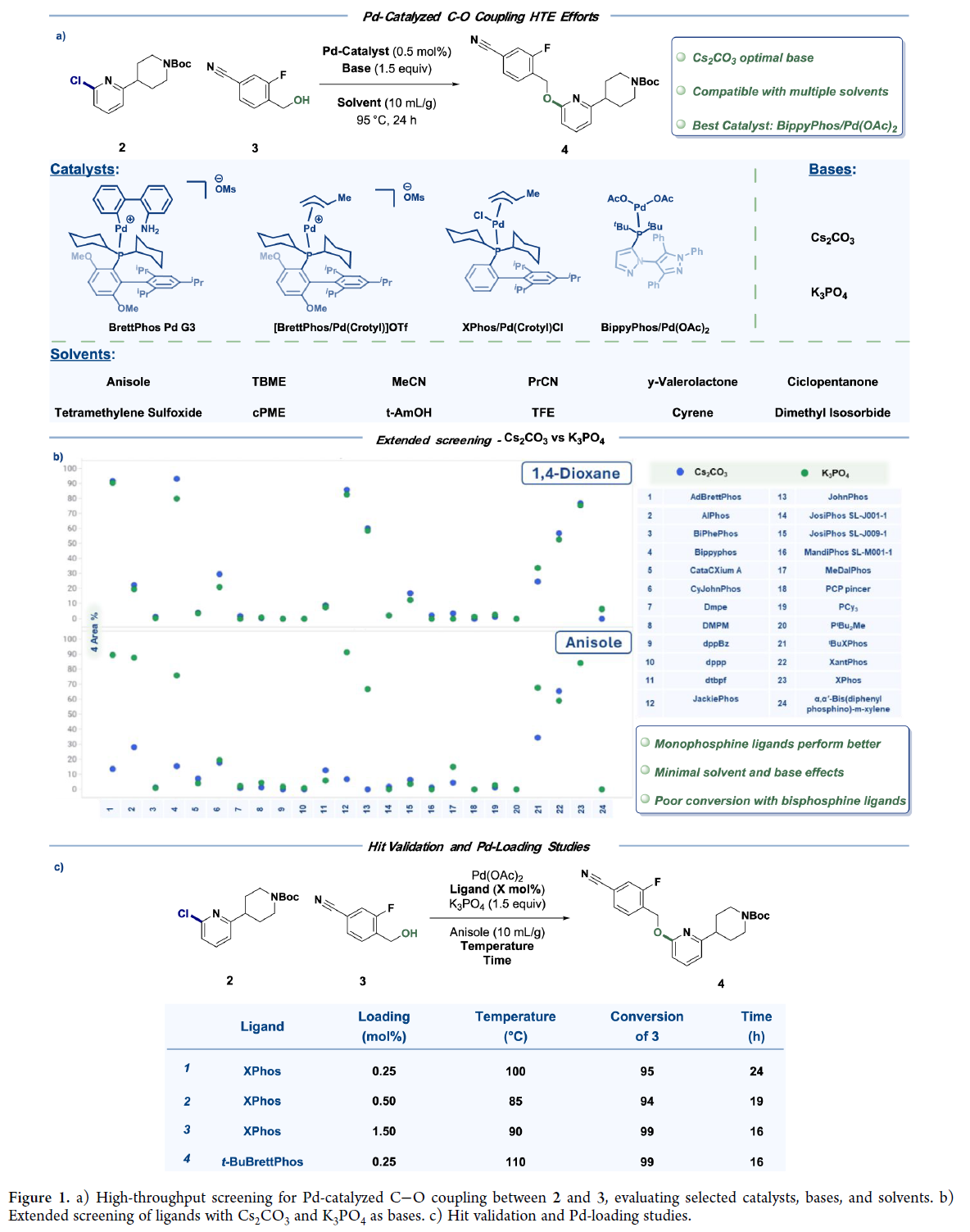 初期尝试以铜替代钯催化剂,旨在降低成本并提升可及性。高通量实验(HTE)筛选出DPEO和BNMO作为潜在铜配体,但优化后产率仅65–69%,且反应对氧气敏感、杂质多;与后续酸脱保护串联时,所得5•TsOH纯度低,需重结晶。综合评估表明铜催化不具稳健性,遂转向钯催化路线。即在钯催化的条件下,作何筛选首先考察12种溶剂、2种碱及多种催化剂(Figure 1a)。结果显示:Cs₂CO₃在多数溶剂中优于K₃PO₄,但其高成本、高密度及废固等问题制约放大。进一步针对24种市售膦配体(Figure 1b)的筛选发现,富电子大位阻单膦(JackiePhos、BippyPhos、AdBrettPhos、AlPhos、XPhos等)可实现2到4的高效转化;而双/三烷基膦普遍转化不完全。其中,关键发现是:溶剂与碱对转化率影响微弱,1,4-二氧六环和Cs₂CO₃可被苯甲醚和K₃PO₄替代。苯甲醚体系重现性好,并支持钯载量显著降低(Figure 1c)。