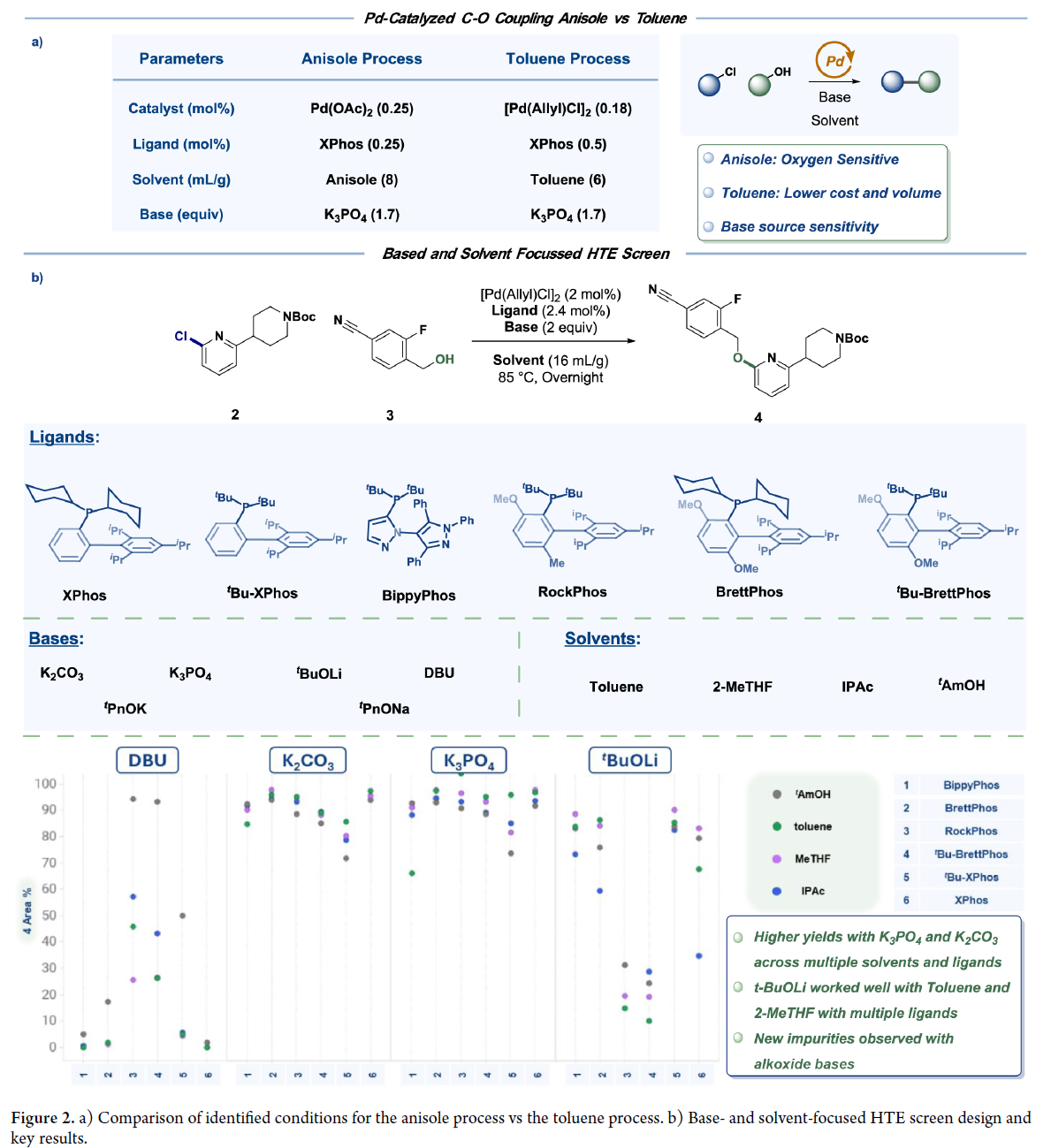 经综合评估配体/催化剂的性能、成本与可及性,选定XPhos/Pd(OAc)₂为最优组合。优化得放大工艺:XPhos(0.25 mol%)、Pd(OAc)₂(0.25 mol%)、K₃PO₄(1.7 equiv)在苯甲醚(10 mL/g)中100 °C反应,成功交付16.4 kg 5•TsOH·H₂O(收率82%)。但苯甲醚成本高、供应受限,推动溶剂替换研究。甲苯:醇混合体系因物理性质差、杂质高被排除;单一甲苯体系表现优异。进一步筛选确认:(allylPdCl)₂/XPhos组合在甲苯中反应更快、杂质更低、收率更高。对比评估显示甲苯工艺稳健性优于苯甲醚(Figure 2a)。K₃PO₄性能高度依赖供应商及物态(无水vs.一水合物):粉末状无水K₃PO₄(小粒径)反应快;一水合物因颗粒粗大导致反应停滞。为此,转向筛选更易控粒径或溶解性更好的碱。