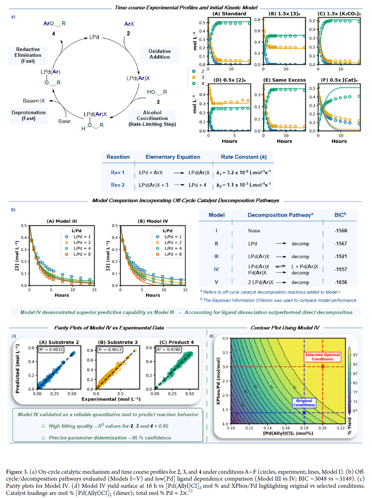 基于Buchwald提出的C–O偶联机制,作者构建并简化多个动力学模型。模型I(Figure 3a)假设氧化加成快速、醇配位为速率决定步,最佳拟合A–E数据。40°C反应1 h后的³¹P NMR显示53.2 ppm特征峰,证实氧化加成中间体为催化休眠态²¹,支持该模型。但模型I在条件F下显著偏离——初速率吻合好,后期偏差增大,表明低负载时催化剂更易失活。为此,我们在模型I基础上引入失活路径(Figure 3b): II:Pd(0)失活; III:氧化加成中间体直接分解; IV:先发生配体解离,再失活; V:氧化加成中间体二聚失活。BIC评估显示,III(−1921)和IV(−1957)远优于I(−1560),且二者接近,说明失活主要经氧化加成中间体,无论是否经配体解离。 进一步为区分III与IV,在[Pd]₀ = 0.14 mol%下系统调节XPhos/Pd比(1–8)。结果表明:IV全面优于III——尤其在L/Pd = 1时,III严重高估底物消耗;在高L/Pd下亦出现偏差;而IV在全部比例下均精准复现时间进程。BIC进一步确认:IV(−3149)> III(−3048)。该结果证实失活源于配体解离平衡,解离后裸露的Pd(II)物种更易降解——这也解释了为何低配体浓度加剧失活。然而,模型IV在全数据集上验证效果优异(Figure 3c):对2、3、4的预测R²分别为0.9829、0.9592、0.9779;所有速率常数95%置信区间宽度<35%,参数高度可靠。