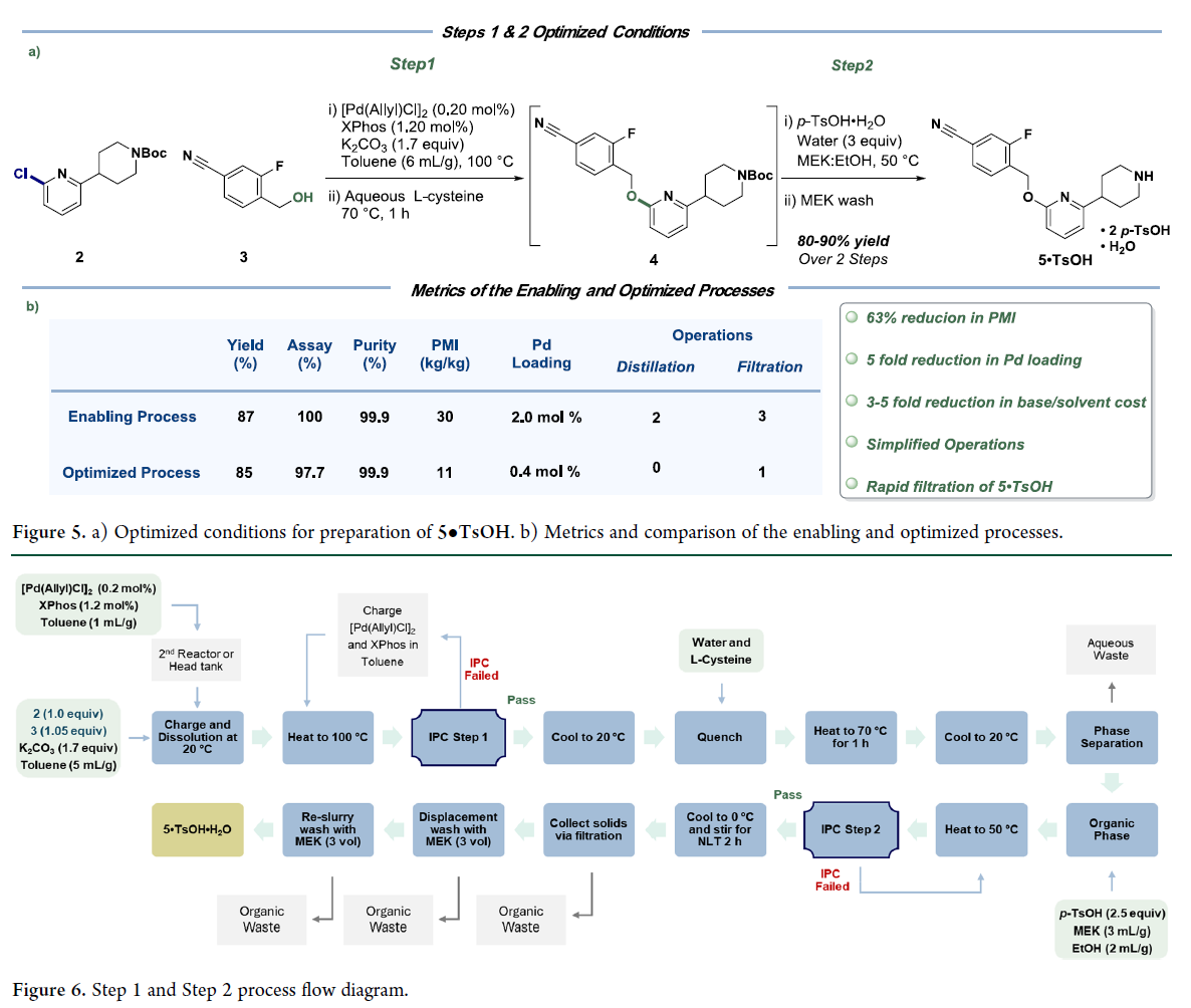 最终工艺(Figure 5a):甲苯中Pd(allyl)Cl₂/XPhos/K₂CO₃催化C–O偶联 → L-半胱氨酸水溶液热洗(除Pd)→ 有机相加p-TsOH·H₂O于50°C反应结晶 → 直接过滤得高纯5•TsOH一水合物。与启用工艺对比(Figure 5b):钯用量从2.0 mol%降至0.4 mol%,碱与溶剂消耗降低3–5倍,PMI由30 kg/kg大幅降至11 kg/kg(−63%);全程取消蒸馏与多次过滤,操作步骤精简,质量稳定。该优化工艺兼具鲁棒性、经济性与绿色可持续性,适用于规模化生产。