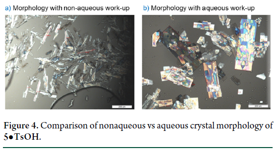 前期引入水相后处理(L-半胱氨酸水洗)已消除过滤瓶颈,并显著提升5•TsOH质量。PXRD与偏光显微镜(PLM)分析证实:水相环境主导晶型——仅在水存在下稳定获得一水合物;非水体系则得针状无水物(Figure 4)。但改用含水金属清除剂后,成核过快,导致晶体细小、夹杂杂质、晶型混杂(一水/半水/无水共存)。 为此,在脱保护中精准补加3 eq水:有效调控成核速率,得到大而规整的板状一水合物晶体,兼具高过滤速率与优异杂质清除能力。