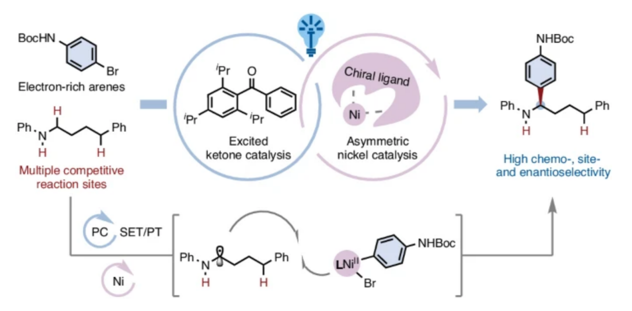 厦门大学的霍浩华课题组开发了一种稳健高效的N-烷基苯胺对映选择性α-氨基C(sp3)–H芳基化方法,该方法利用先进的金属光氧化还原催化体系。通过采用精心设计的位阻芳基酮光催化剂与富电子手性双咪唑啉配体,该策略解决了胺官能团化领域长期存在的难题。本方法展现出宽泛的底物适用性,可兼容多种N-烷基苯胺与芳基溴,并实现优异的化学选择性、位点选择性和立体选择性。