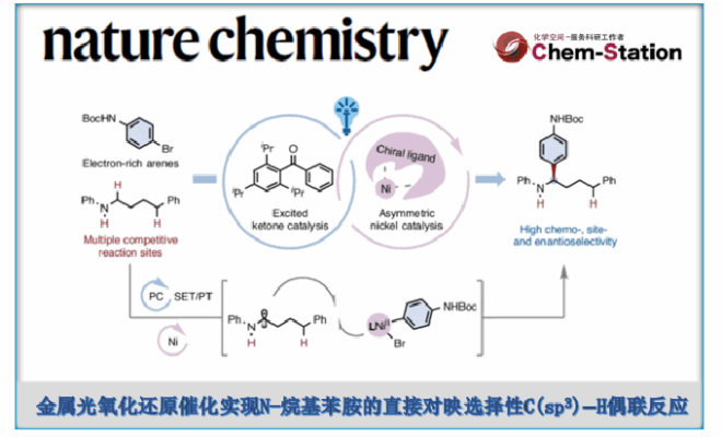 近日,厦门大学的霍浩华课题组在Nat. Chem.中发表论文,报道一种全新的金属光氧化还原催化的自由基方法,实现了N-烷基苯胺的α-C(sp3)–H芳基化反应。该方法引入了一种结构简单且具有位阻效应的芳基酮光催化剂,其关键创新在于有效抑制了不利的逆向电子转移过程,从而实现高效的α-anilinoalkyl自由基生成。该策略通过连续的单电子转移与质子转移过程,克服了现有方法的多种局限。结合手性镍催化剂,还可实现多种N-烷基苯胺与各类(杂)芳基卤的位点选择性、对映选择性芳基化反应。此外,该方法展现出卓越的官能团耐受性,能够对复杂分子的结构进行模块化官能团修饰。