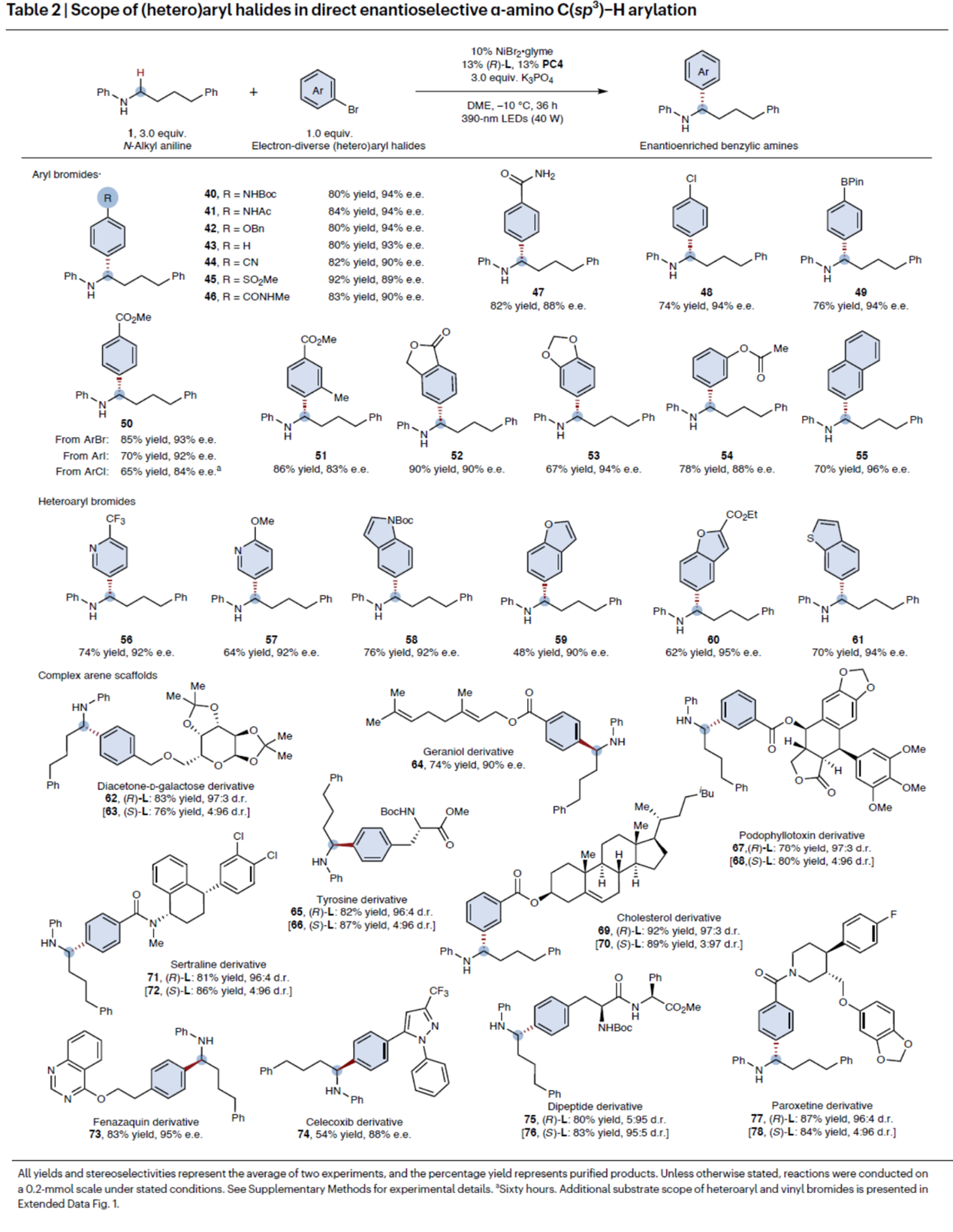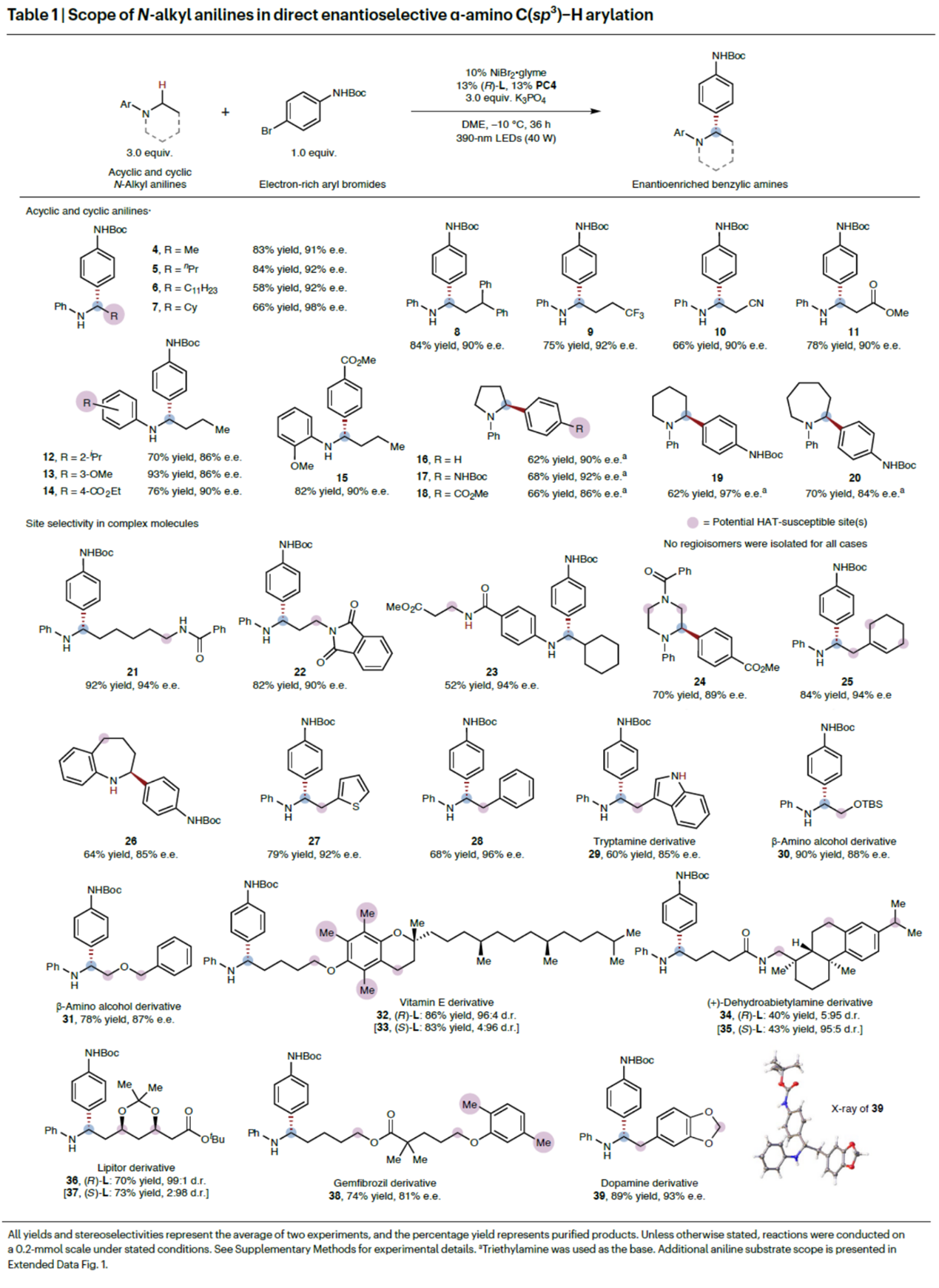 在上述的最佳反应条件下,作者对一系列N-烷基苯胺的底物范围进行深入研究(Table 1)。研究结果表明,一系列非环状二级烷基胺或环状三级烷基胺,均可与N-Boc-4-溴苯胺顺利进行反应,获得相应的产物4–20,收率为58-93%,ee为84-98%。同时,一系列具有不同HAT敏感性C(sp3)−H键的N-烷基苯胺,也成功参与了反应,实现了优异的化学选择性、位点选择性和立体选择性,获得相应的产物21–39,收率为40-92%,ee为81-96% ee,dr高达99:1。