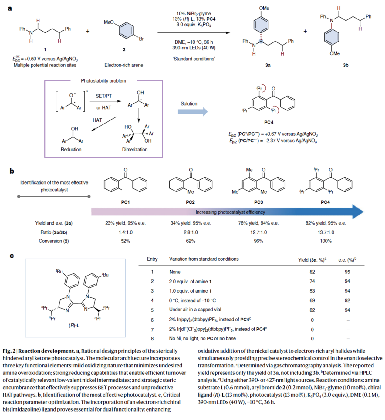 首先,作者采用N-烷基苯胺1与4-溴苯甲醚2作为模型底物,对反应的光催化剂进行了设计与筛选(Fig. 2)。进而确定最佳的反应条件为:采用NiBr2·glyme作为催化剂,(R)-L作为手性配体,PC4作为光催化剂,K3PO4作为碱,390 nm LEDs (40 W)作为光源,在DME反应溶剂中,反应温度为-10 oC,最终获得82%收率的产物3a(95% ee)。