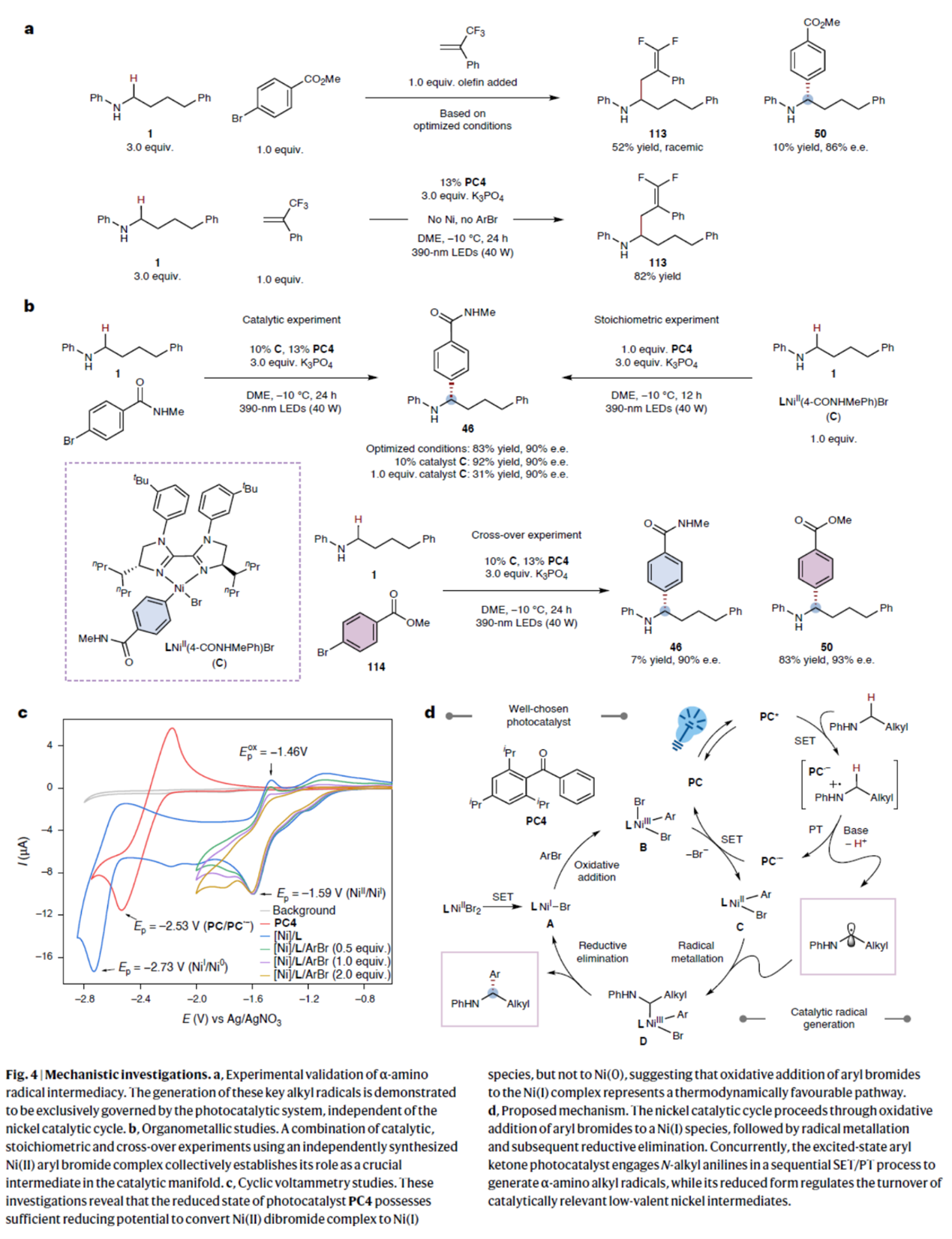 最后,作者对反应的机理进行了研究(Fig. 4)。首先,自由基捕获实验结果表明,反应形成了α-氨基烷基自由基。同时,这些关键烷基自由基的生成完全受光催化体系控制,与镍催化循环无关(Fig. 4a)。其次,通过对独立合成的芳基溴化镍(II)配合物C进行催化实验、化学计量实验及交叉实验,综合研究结果共同证明该配合物是催化循环中的关键中间体(Fig. 4b)。此外,CV实验结果表明,还原态光催化剂PC4具有足够的还原能力,可将二溴化镍配合物转化为Ni(I)物种,但不能还原至Ni(0)状态。因此,芳基溴化物与Ni(I)配合物发生的氧化加成反应是一条热力学上可行的途径(Fig. 4c)。基于上述的实验研究,作者提出如下合理的反应机理(Fig. 4d)。该过程始于二级苯胺与三重态光催化剂(PC*)之间的单电子转移(SET),形成离子-自由基对。在碱存在下,这些离子自由基物种通过质子转移(PT)生成α-氨基烷基自由基和羰基负离子自由基(PC·−)。同时,由镍(II)预催化剂通过羰基负离子自由基单电子还原产生的溴化镍(I)配合物A,与芳基溴发生氧化加成,形成二溴化芳基镍(III)配合物B。该配合物被羰基负离子自由基还原,再生成基态光催化剂和溴化芳基镍(II)配合物C。后者捕获氧化生成的烷基自由基,形成镍(III)配合物D。最终,经还原消除得到对映体富集的苄胺,并再生溴化镍(I)配合物A并进入后续催化循环。当前阶段,尽管不能完全排除潜在的镍(0)/镍(II)机理路径,但根据上述的机理研究,该可能性较低。