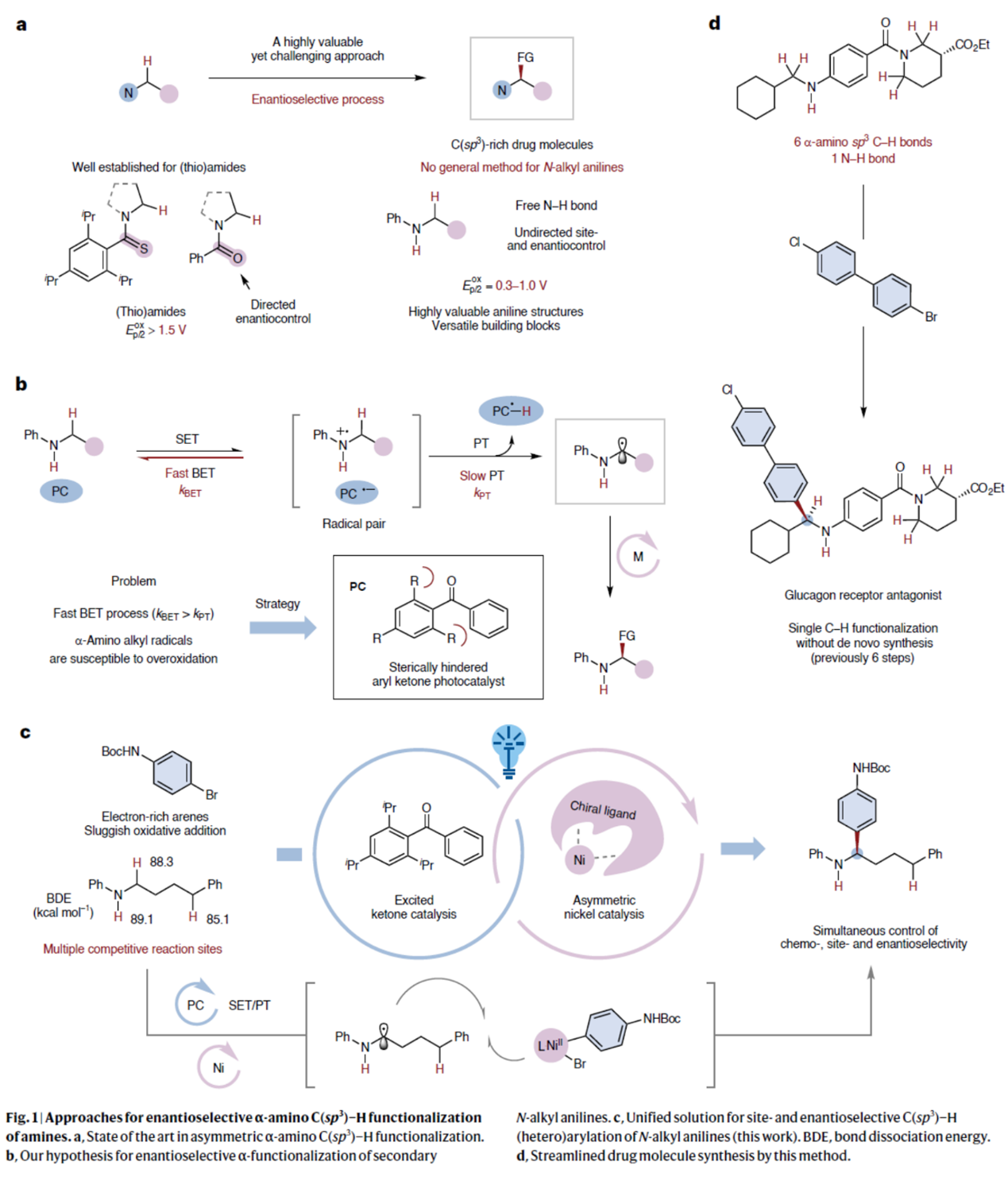 为展示这一概念独特的策略,霍浩华课题组选择采用镍金属光氧化还原催化体系,实现N-烷基苯胺与多种芳基卤的C(sp3)−H芳基化反应(Fig. 1c)。具体而言,霍浩华课题组设想三线态激发态酮类光催化剂可通过高选择性的单电子转移/质子转移(SET/PT)过程活化N-烷基苯胺,从而产生α-氨基烷基自由基。随后,该碳中心自由基与芳基溴在手性镍催化剂作用下发生对映选择性偶联,生成具有重要价值的胺类分子。因此,若能实现该策略,将开辟全新的逆合成分析路径,并无需从头合成即可加速从现有药物库中发现先导化合物(Fig. 1d)。