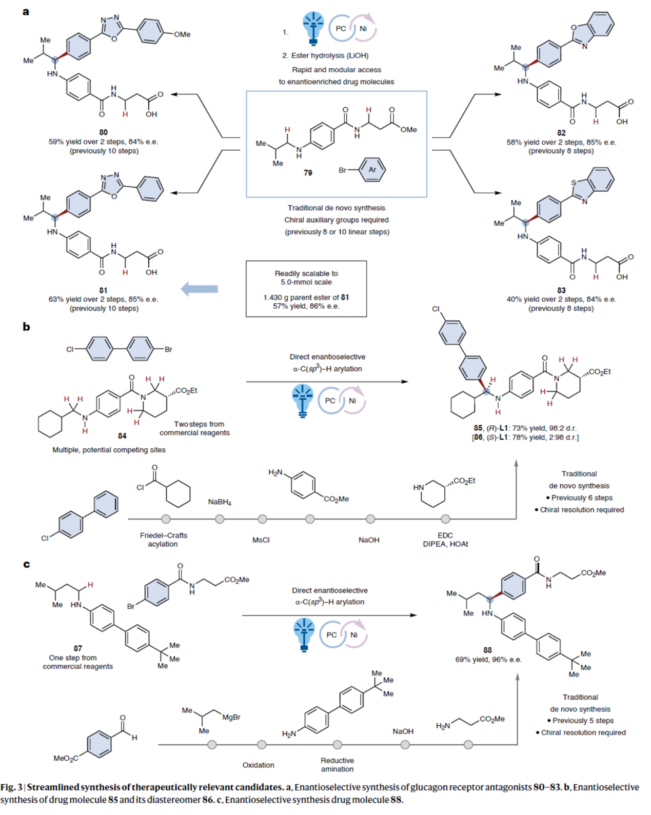 接下来,作者对反应的实用性进行了研究(Fig. 3)。首先,作为治疗糖尿病用胰高血糖素受体拮抗剂的手性苄胺化合物80–83,此前合成时需采用手性助剂策略,经历八至十步反应。相比之下,采用上述的新方法仅需两步即可模块化合成这四种分子(总收率40–63%,ee为84–85%)。该方法以单一原料N-烷基苯胺79与市售芳基溴为直接起始物料,通过高效的C–H芳基化/酯水解串联反应实现。其次,兼具胰高血糖素受体拮抗活性、可用于糖尿病预防或治疗的苄胺化合物85及其非对映异构体86,此前的合成需经历六步反应,且须对每个非对映异构体进行手性色谱拆分。采用上述的方法通过催化对映选择性合成技术,以N-烷基苯胺84与市售芳基卤为原料,一步实现两种非对映异构体的合成,并具有良好的收率与优异的立体选择性。此外,作为胰高血糖素受体拮抗剂的苄胺化合物88,其原工艺需五步合成,且须通过手性拆分才能获得两种对映异构体中的目标构型。采用上述的方法,可直接以简单N-烷基苯胺87为原料合成该分子,具有69%收率及96%ee。