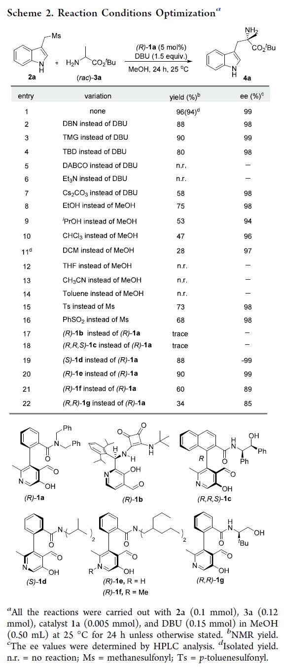 首先,作者以吲哚衍生物(2a)和α-甲基甘氨酸酯(3a)作为模型底物对反应条件进行了筛选(Scheme 2)。研究结果表明:1)碱性较强的有机碱(DBU、DBN、TMG、TBD)效果最优,以80-96%的产率和98%ee获得相应产物(entries 2–4),碱性较弱的有机碱(DABCO、Et₃N)难以驱动2a生成活性吲哚烯亚胺中间体对反应无效(entries 5–6),而Cs₂CO₃可反应,但产率中等(entry 7);2)醇类溶剂(MeOH、EtOH、iPrOH)的效果最佳(entries 8–11),因2a在 THF、CH₃CN或甲苯中的溶解性较差导致不反应(entries 12–14);3)对甲苯磺酰基(Ts)和苯磺酰基(PhSO₂)优于甲磺酰基(Ms)。因其更强的吸电子性加速烯亚胺形成,导致α-氨基碳负离子捕获滞后,引发甲醇加成等副反应,产率下降(entries 15–16);4)联苯基手性吡哆醛(1a)高效催化反应,以96%的产率和99% ee获得产物(entries 17–22),中心手性类似物(1b)、联萘基手性吡哆醛(1c)几乎不反应(entries 17–18)。增大侧链位阻(1d、1e)降低产率(entries 19–20)。N-甲基手性吡哆醛(1f)和氨基醇型催化剂(1g)活性低、对映选择性差(entries 21–22),进而表明,该转化无需更高亲电性的醛基,也不依赖氢键供体侧链。