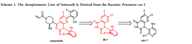 索托拉西布(Sotorasib)(Scheme 1)是一种靶向药物,它像一把设计精巧的”钥匙”,能够特异性地锁住并失活由KRAS G12C突变产生的异常蛋白,从而阻断癌细胞的生长信号。索托拉西布的药物活性成分含稠合双杂环核心和丙烯酰胺共价弹头,特异性靶向KRASG12C。分子含一个手性中心和一个阻转轴,其中(S,M)-二对映体生物活性最优。其中,轴手性极为稳定(旋转能垒42.3 kcal/mol,25°C下半衰期>100亿年)。