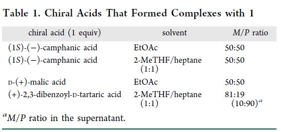 进一步为明确低 M/P 样品的组成,开展 1H NMR 分析,结果显示其 DBTA 含量低于理论值(1.0 equiv per 1)。尝试将纯化后的 P–1 置于标准拆分条件下,未能获得 P–1/(+)-DBTA 共晶溶剂化物,进而表明低 M/P 源于 rac–1 与 M–1/(+)-DBTA 复合物的共结晶。鉴于完全拆分所需 (+)-DBTA 的理论下限为 0.5 equiv(相对于 rac–1),提高 (+)-DBTA 浓度有望加速 M-1/(+)-DBTA 在溶液中的形成,并优先驱动其结晶。
