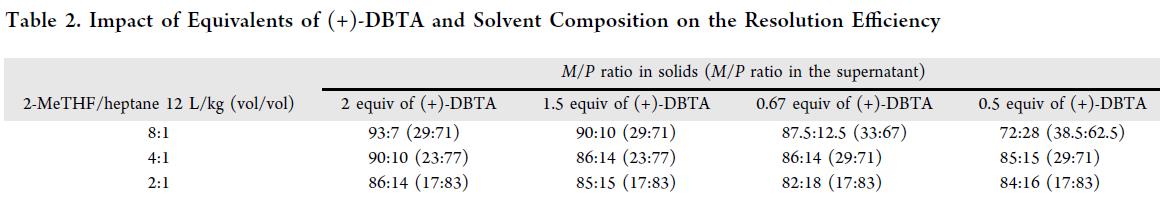 同时,考察(+)-DBTA 用量对选择性的影响(Table 2)。实验表明:M/P 比值随(+)-DBTA 当量增加而升高,但随庚烷比例升高而降低。因此,在高比例 2-MeTHF 下提高(+)-DBTA 用量可最大化 M/P,但会牺牲回收率。