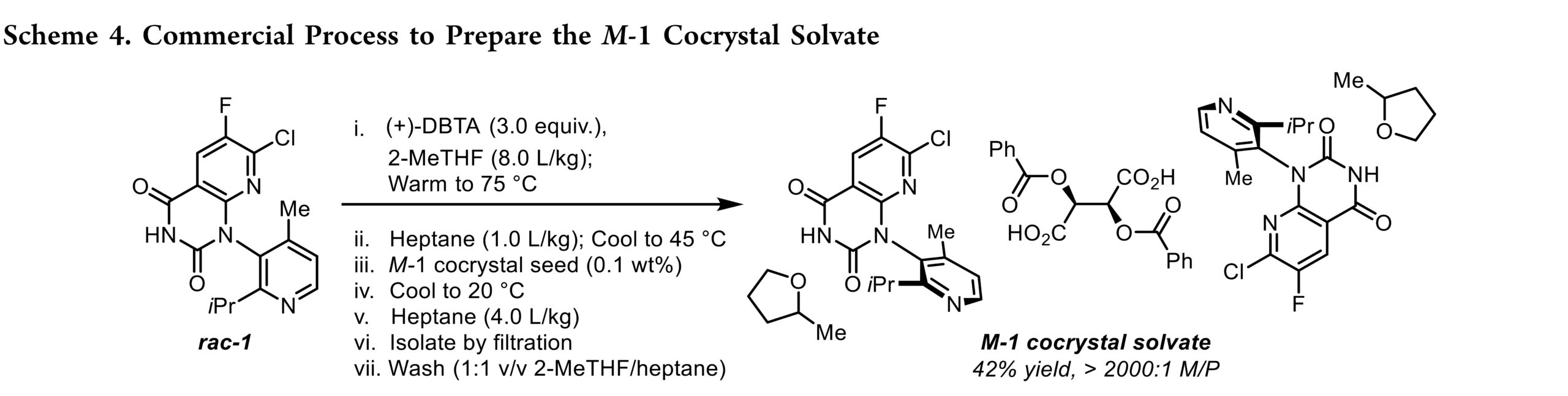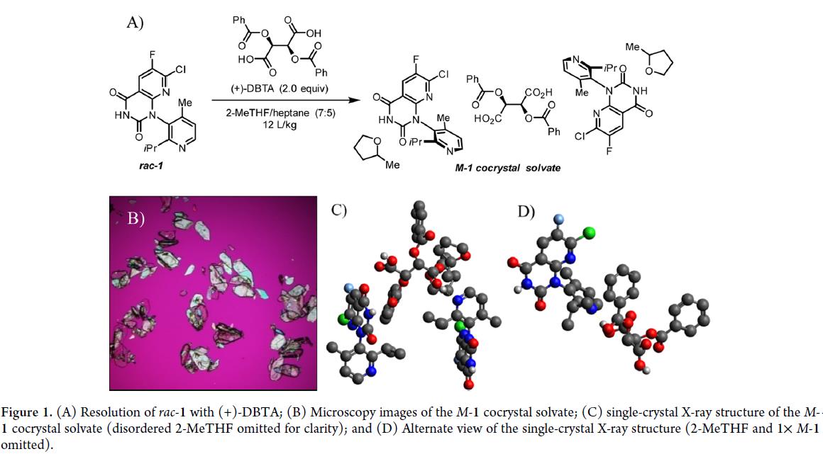 此前所有实验均采用“浆液到浆液”模式——即 rac–1、(+)-DBTA 与 2-MeTHF/庚烷一次性投料。为提升效率,改用受控的“溶液到浆液”工艺:先在 75 °C 下用纯 2-MeTHF(7.0 L/kg)完全溶解 rac–1 和(+)-DBTA(2 equiv),再于 65 °C 加入庚烷(2.0 L/kg)反溶剂及晶种析出浆液;随后冷却至 20 °C 并补加庚烷(3 L/kg)深度脱饱和,最终获得 M/P >99.9:0.1 的产物,分离收率 44%(理论上限 50%)。该结果证实,精准控制溶解、成核与结晶过程可实现高效拆分。NMR 显示产物组成为 M-1: (2-MeTHF):(+)-DBTA(2:2:1),单晶 X 射线结构证实其为三组分氢键共晶溶剂化物(Figure 1)。产物中 2-MeTHF 含量受干燥条件影响,通常为 2–3 equiv。
