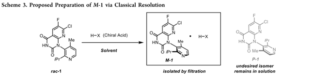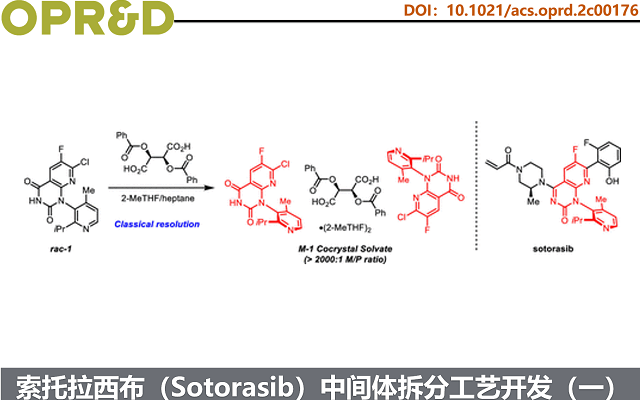 药物研发初期,索托拉西布通过多步合成制备,且关键中间体为rac–1。在临床前及早期临床阶段,采用手性色谱(包括标准柱色谱和模拟移动床)成功拆分 rac–1,获得目标构型中间体 M–1,支撑毒理学评价和首次人体试验。但该方法周期长、成本高、溶剂消耗大,导致工艺质量强度高、供应链复杂,不适用于商业化生产。因此,转向开发高效手性拆分工艺,以实现 M–1 的稳定、无需色谱分离商业供应,保障索托拉西布的长期量产。