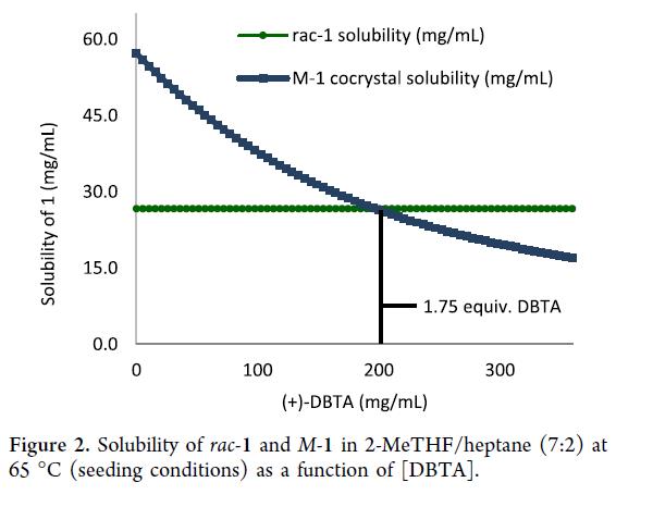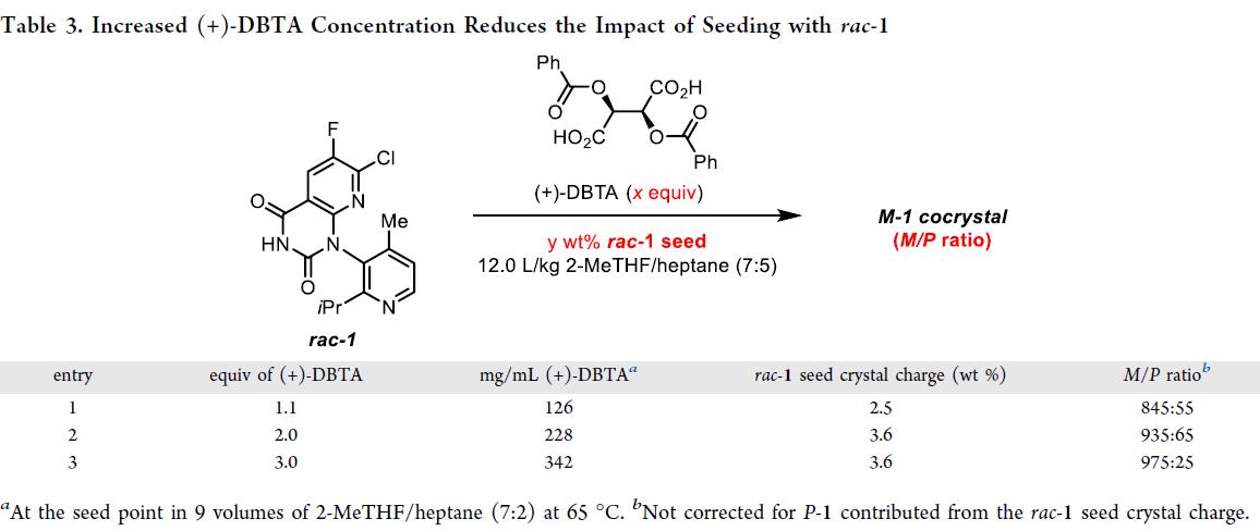 接下来,优化(+)-DBTA 用量以提升工艺稳健性,并利用各组分溶解度数据构建热力学模型。建模条件:2-MeTHF/庚烷 = 7:2(9.0 L/kg),晶种温度 65 °C。模型预测:rac–1 溶解度不受(+)-DBTA 浓度影响(Figure 2),而 M–1 共晶溶剂化物的相对溶解度随(+)-DBTA 浓度升高而显著降低,即当浓度 >200 mg/mL(≈1.75 equiv)时,其结晶在热力学上占优;同时,更高浓度可加速 M–1 复合,抑制 rac–1 共结晶。该模型经三组不同(+)-DBTA 浓度的实验验证:以 rac–1 为晶种模拟最差工况,结果与模型一致——(+)-DBTA 浓度越高,M/P 比值越高(Table 3)。据此,选定 3.0 equiv(+)-DBTA 作为工艺标准用量,确保高 M/P 产物稳定输出。