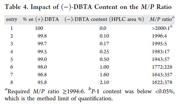 随后,聚焦(+)-DBTA 的对映体纯度要求。鉴于用量远超理论最小值(3.0 vs 0.5 equiv),痕量(−)-DBTA 可能显著劣化产物 ee。加标实验表明:仅含 0.10%(HPLC 面积比)(−)-DBTA 即降低选择性;更高含量则严重恶化 M/P 比(Table 4)。因此,将(+)-DBTA 的杂质限值设定为 ≤0.10%(LC 面积比),即 ≥99.8% ee,以保障产物 M/P ≥1994:6(≥99.4% ee)。