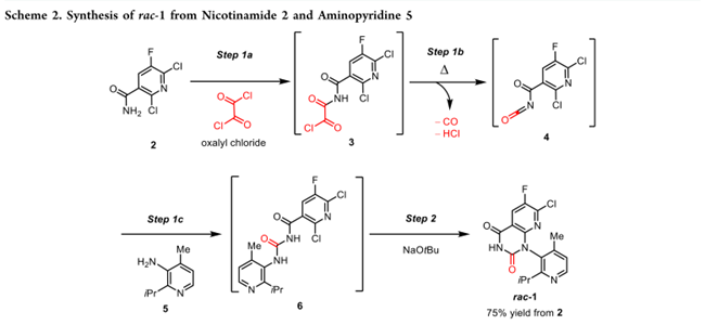 rac–1 通过烟酰胺 2 的多步串联反应制备(scheme 2)。即2在DCM中与草酰氯反应生成中间体 3;加热促使 3 同步脱羧、脱氯化氢,得到酰基异氰酸酯 4。4 不经分离,直接与氨基吡啶 5 反应生成酰基脲 6。随后经水相处理、溶剂置换为 2-甲基四氢呋喃(2-MeTHF),再加入叔丁醇钠(NaOtBu)引发分子内环合,析出结晶得 rac–1。该工艺已成功放大至 2 投料量 >100 kg,总收率 75%。