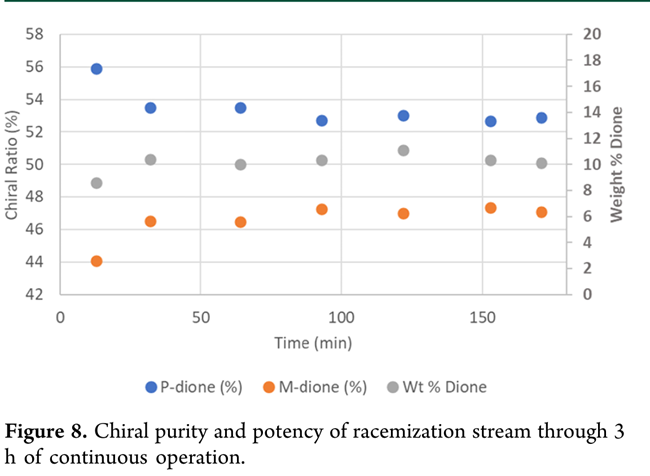 千克级实例在1.1 L PFR中完成(产能>0.5 kg/h rac–1),配套90 mL管中管预热器。TCU设定315 °C,但因保温不足,PFR实际运行温度为290 °C(Figure 8首点显示转化率下降)。通过降流速(85→80 g/min)延长表观停留时间(12.94→13.75 min),补偿低温影响。3 h连续运行中,HPLC监测显示:总1浓度稳定在~10 wt%,ee由88:12降至53:47(P/M),质量平衡良好,产物接近外消旋。