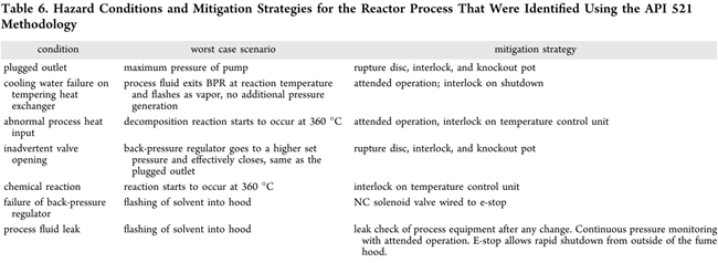 对比直接电加热或烘箱式管式反应器,HTF夹套设计虽体积略大、升温稍慢,但显著提升φ值——低φ系统易因温控延迟引发热失控,需额外工程补偿。鉴于工艺温度(315–370 °C)接近ARC起始温度(347 °C),且远超苯甲醚常压沸点(155 °C),依据API RP 521标准开展泄压评估:计算确定安全泄放口尺寸与PFR管径相当。中试系统增设多重防护:背压阀(BPR)(Table 6)下游串联爆破片+分离罐,并配置NC电磁阀(与紧急停车联锁);急停可手动或自动触发,同步关停进料泵及通风橱内全部设备;温控单元独立置于通风橱外,确保急停后仍可持续冷却。