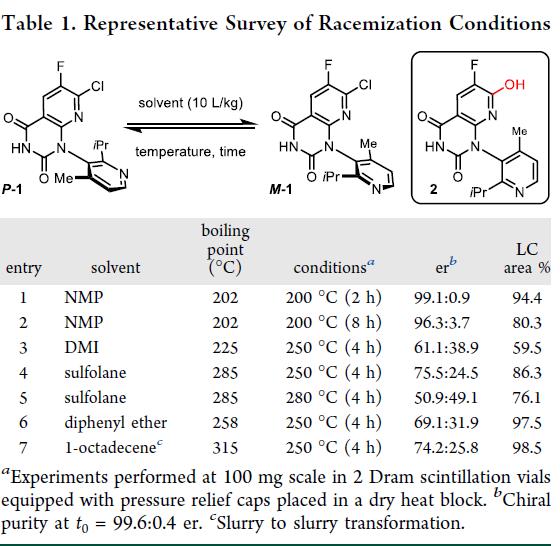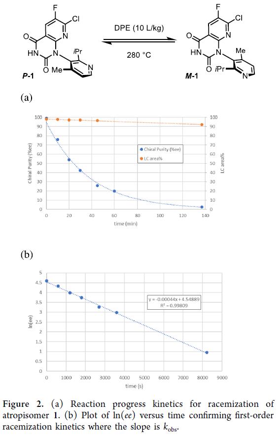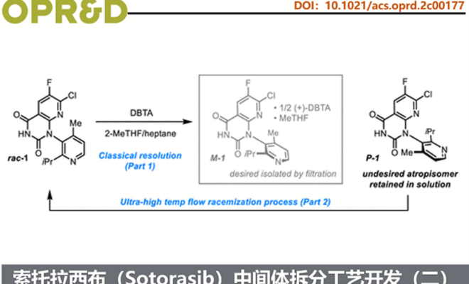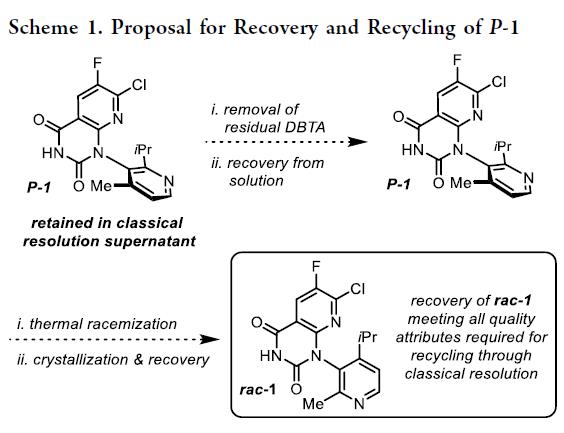 前述,Amgen, Inc的科学家采用(+)-2,3-二苯甲酰-D-酒石酸[(+)-DBTA]对索托拉西布关键中间体进行经典拆分,获得所需atropisomer M–1。该工艺理论收率上限为50%,副产物P-1随母液废弃。为响应安进可持续发展与持续改进目标,希望回收废液中的P-1,经高温连续流消旋化转化为高纯度rac-1,实现其循环用于拆分(Scheme 1)。