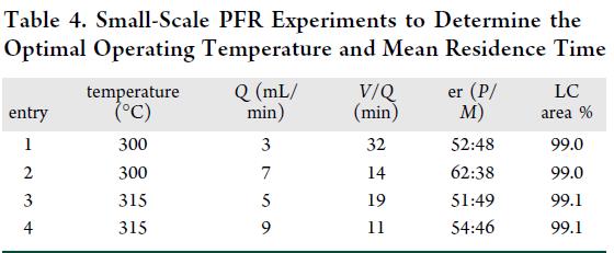 据此构建小型PFR(90 mL,316L不锈钢管中管换热器,ID 0.18″,L=217″;Figure 5)。出口物料经调温换热器快速冷却至<155 °C(苯甲醚常压沸点),再经伴热管线与背压阀(BPR)进入收集罐结晶。实验表明:仅需11 min平均停留时间(V/Q),即可实现完全消旋,且无明显分解。结合动力学与溶解度数据(Table 3),最终确立优化工艺:10 wt% P-1/苯甲醚溶液,315 °C下停留11 min,产出近乎外消旋(<2% ee)、高化学纯度(≥99.0% LC面积%)的rac–1溶液,冷却后直接结晶。Table 4实验统一采用50 mg/mL进料浓度,以抑制高温进料段局部过饱和与析出风险。