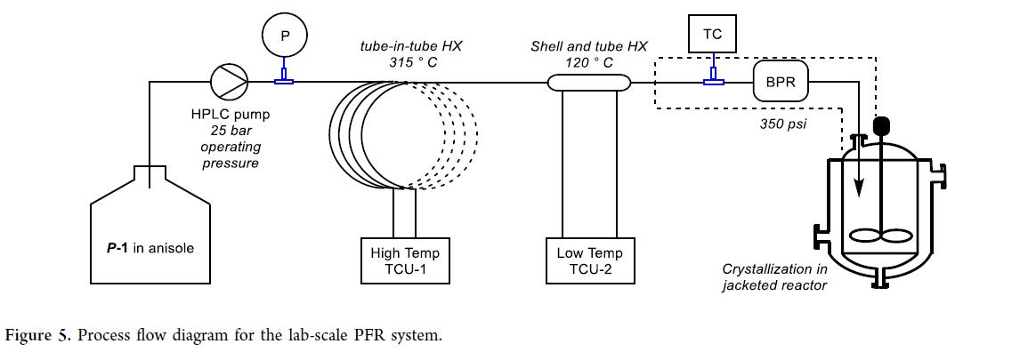 前期外消旋化研究采用高ee P-1(>99:1 P/M)以加速开发与概念验证。为推进放大,改用经典拆分母液来源的粗品(88:12 P/M)。该物料在目标进料浓度(10 wt%)下于苯甲醚中析出浆料,故采用“共熔富集”策略:配制17 wt%浆料,平衡至共熔点后过滤得上清液(99:1 P/M)与rac–1固体(50:50 P/M);前者稀释至10 wt%作PFR进料,后者作下游结晶晶种。工艺采用两级换热器,预热至315 °C、冷却至120 °C;未来可集成为一机,利用反应液余热预热进料以节能(Figure 7)。