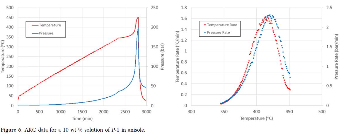 DSC(高压坩埚,400 °C)显示:纯苯甲醚及10 wt% P-1/苯甲醚溶液在360 °C以下无显著放热;360 °C以上出现微弱放热,对应苯甲醚超临界转变(Tc = 372.4 °C,Pc = 41.9 atm)。ARC进一步验证:10 wt%溶液自热起始温度为347 °C,压力升至系统极限199 bar(Figure 6),最大温升与压升速率分别为1.62 °C/min和2.31 bar/min。经φ因子校正后,其热失控时间(TMRad)达70 h(按PFR操作温度计),超目标停留时间100倍以上。结合背压推算,反应最高技术温度为370 °C(该压力下沸点),据此判定为Stoessel Class 2工艺。综合表明:在配备温压联锁监控的前提下,系统可安全运行。