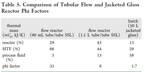 流动反应器的安全优势不仅源于高比表面积带来的强化传热,更在于夹套与导热介质(HTF)赋予的高热惯性。φ因子(系统总热容/物料热容)定量表征该特性:φ=1表示反应器无热容贡献(如大型间歇釜);φ越高,系统吸热缓冲能力越强。实测筛选用管式反应器φ≈33(工艺流体仅占3%热容,HTF占~70%,Table 5);中试反应器φ≈8;而典型千升玻璃釜φ≈2。高φ值、高导热壁材与高压设计共同构成三重安全冗余。