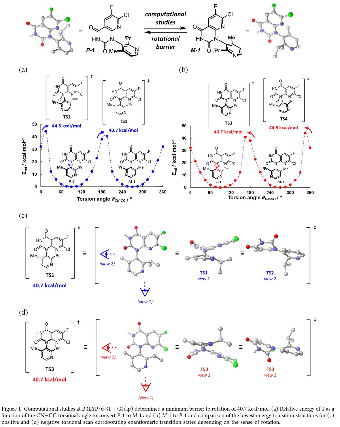 DFT计算表明:P–1→M-1的旋转能垒为40.7 kcal/mol(Figure 1a,b)。其种,高能垒源于手性轴周边显著位阻,C–N键旋转迫使P–1发生大幅结构扭曲,导致其热稳定性高、难以消旋。正/负向扭转扫描所得能量曲线呈镜像对称,且能垒峰值偏离理想0°/180°(Figure 1a,b)。过渡态分析(1-TS1和1-TS3)进一步表明:旋转过程中尿嘧啶氮原子因几何畸变而产生手性,形成一对对映过渡态,从而解释上述非对称能垒分布(Figure 1c,d)。