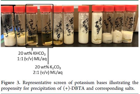 前述,P–1母液无法直接高温消旋:2-MeTHF与庚烷在>300 °C下蒸气压过高,且残留(+)-DBTA过量(2.75 eq),易干扰后续反应。因此需先高纯度回收P–1。即开发了两步纯化工艺:(1)碱洗脱除(+)-DBTA;(2)结晶得P-1固体。其中,碳酸钾水溶液(20 wt%)被确定为最优碱洗体系。系统筛选多种无机碱发现,多数导致(+)-DBTA或其盐沉淀;溶解度研究表明,其二钾盐水溶性显著优于单钾盐及其他反离子盐(Figure 3)。仅20 wt% KHCO₃(1:1 v/v)和20 wt% K₂CO₃(1:2 v/v)可避免明显析出,后者因体积效率更高被选定。进一步优化明确关键操作窗口:严格控制加料速率、温度与相比,以实现清晰相分离、最大限度抑制沉淀,并将(+)-DBTA去除至下游消旋工艺要求的不可检出水平(<10 ppm);同时将P–1在水相中的损失控制在7.5%以内。采用反向加料(母液缓慢加入含K₂CO₃的搅拌釜)可维持局部高碱浓度,有效阻止单钾盐生成。