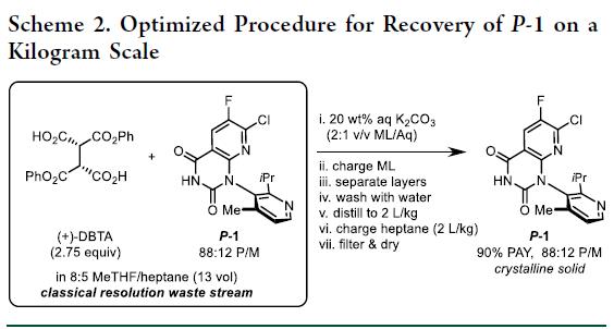 结晶工艺基于P–1在2-MeTHF/庚烷中的溶解度特性开发,并经千克级验证(scheme 2)。典型操作:母液按1:2(v/v)反向加入20 wt% K₂CO₃水溶液,实现高效萃取(>99% DBTA进入水相);分相后,有机相水洗除盐;浓缩至2 L/kg(以P–1计),再加入庚烷(2.0 L/kg)反析,得均匀浆料;过滤、干燥后获得P–1晶体(P/M = 88:12),收率90%,纯度与晶型完全满足后续高温消旋要求。