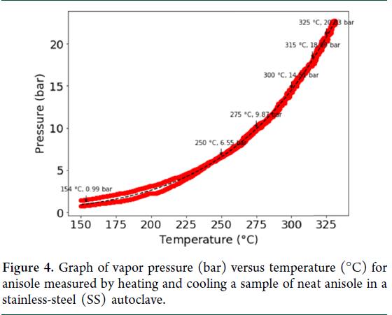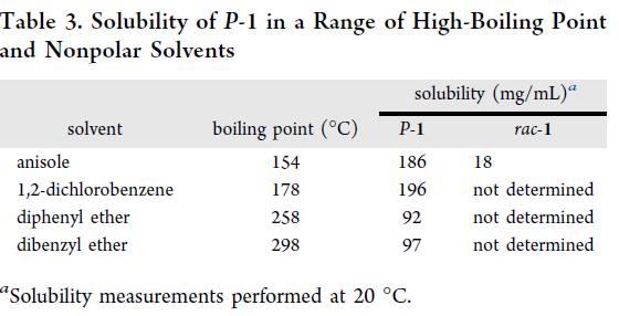 前述高旋转势垒(ΔG‡ = 42.3 kcal/mol)表明,P–1 的热消旋需极端条件,导致传统间歇设备无法满足。为此,设计了连续推流式反应器(PFR):其窄管结构保障高效传热;精确调控停留时间与分布;集成实时温压监测,兼顾安全与质量。为实现高产率、小体积及低过渡损耗,目标设定为“分钟级完全消旋”。动力学模型明确要求温度 ≥300 °C(Table 2)。小规模实验堆对溶剂筛选显示,苯甲醚综合最优:对P–1溶解性好、成本低、热稳定性与操作安全性突出(Table 3)。其对rac–1的溶解度显著更低(< P–1的1/5),支持反应液直接冷却结晶,无需反溶剂。进一步测定立体化学相图共熔点:P/M为67:33–83:17的悬浮液,上清液恒为99:1(P/M),证实可通过结晶富集高ee P–1以配制PFR进料,并可于消旋后选择性去除残余P–1。此外, 蒸气压测定(150–325 °C)拟合安托万方程(Figure 4),表明300–325 °C下需≥20 bar系统压力以维持苯甲醚液相。25 mL高压釜批式验证:35 mg/mL P–1/苯甲醚溶液于300 °C停留10 min(>200 °C总时长1 h),得4% ee,非手性纯度>99% LC面积%,确认溶剂适用性。