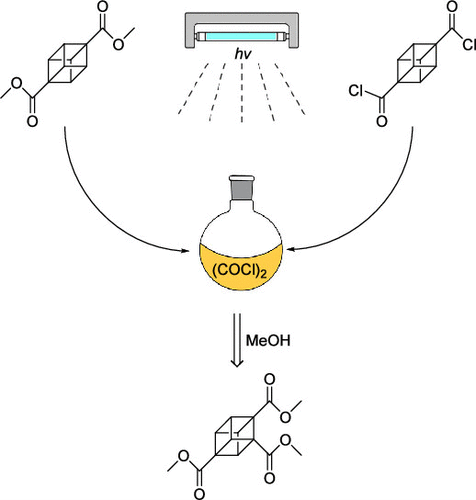 首先,作者对其前体进行合成(Scheme 1)。即1)在立方烷-1,4-二甲酸二甲酯和草酰氯的体系下用9 W UV-B灯室温照射7天,即可高效制备关键前体,立方烷-1,2,4-三甲酸三甲酯(1,20 g 规模,80%产率)。其效果与150 W Hg灯照射的相当。值得注意的是,反应时持续释放HCl和CO,通过标准甲醇淬灭/柱层析即可纯化1。对应二酰氯反应更快:5天达~80%,7天(10 g规模)产率升至93%,进而证实其活性高于二甲酯。 进一步延长辐照(>7天)可少量生成立方烷-1,2,4,7-四甲酸四甲酯(NMR鉴定并分离),表明该路径适用于四取代衍生物合成。