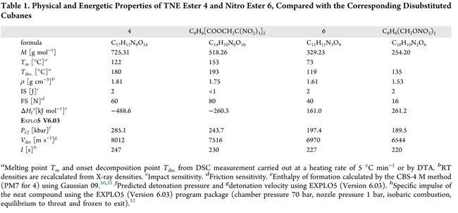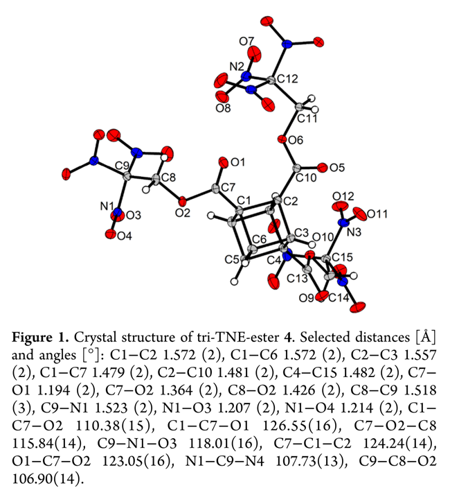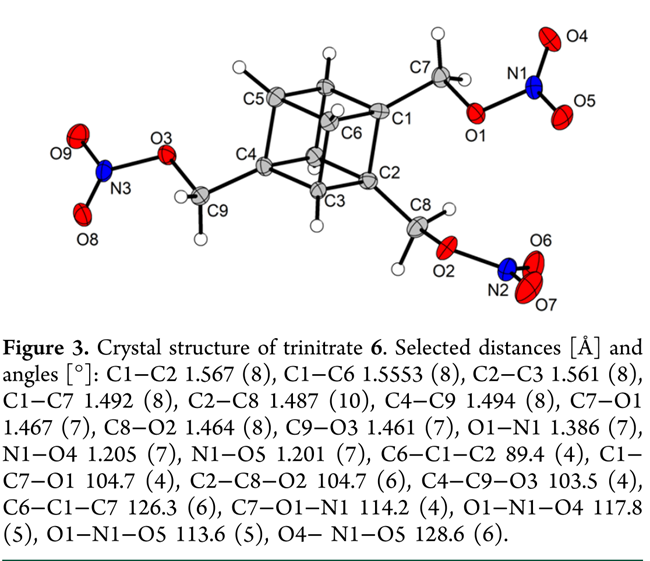 Burkhard Krumm教授等人开发了一种立方烷-1,2,4-三羧酸三甲酯的改进型克级合成法,支撑该三取代体系的系统性研究与衍生化,成功制备并全面表征了多种三取代立方烷衍生物,包括首例含能三取代立方烷(4、5、6)。其中,4、5和6的单晶结构已获解析。相较于二取代类似物,三取代含能立方烷热稳定性降低,但密度与能量性能更高,源于更高的堆积密度及更多含能基团引入所致的环张力增大。目前,更高取代度立方烷体系的研究正在推进,有望获得性能更优的新材料。