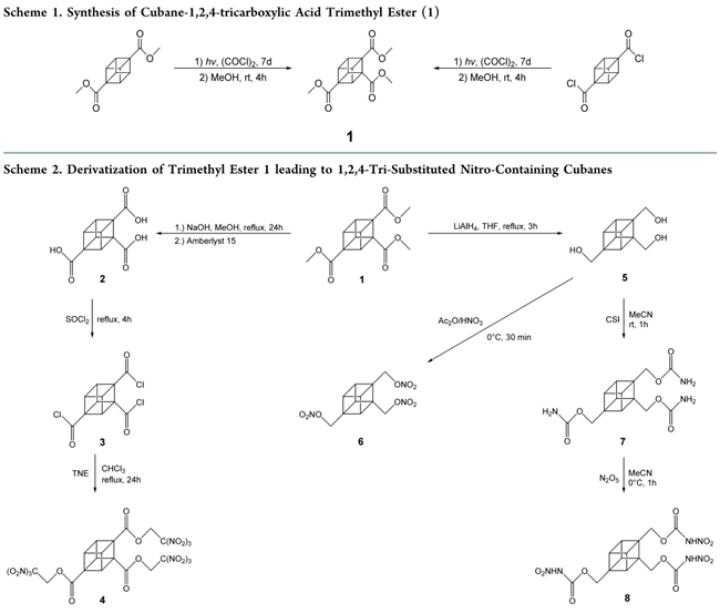 其次,对前体1进行相关衍生化(Scheme 2)。即1)1经碱性水解及离子交换树脂酸化,以94%产率得水溶性立方烷-1,2,4-三羧酸(2);继而用SOCl₂氯化,首次获得可分离的立方烷-1,2,4-三羰基氯(3)(此前仅NMR检出)。3与过量的三硝基乙醇(TNE)回流2天,经柱层析+重结晶以30%的产率获得立方烷-1,2,4-三羧酸三(2,2,2-三硝基乙酯)(4);2)1经LiAlH₄还原,以96%产率得立方烷-1,2,4-三甲醇(5);5再经HNO₃/Ac₂O硝化,得立方烷-1,2,4-三甲基硝酸酯(6);3)化合物5与氯磺酰异氰酸酯(CSI)反应,以96%产率高效制得立方烷-1,2,4-三甲基氨基甲酸酯(7)。7的硝化可生成目标硝基氨基甲酸酯(8)(NMR检测获得,并未分离纯化)。
