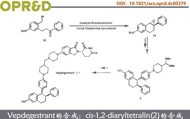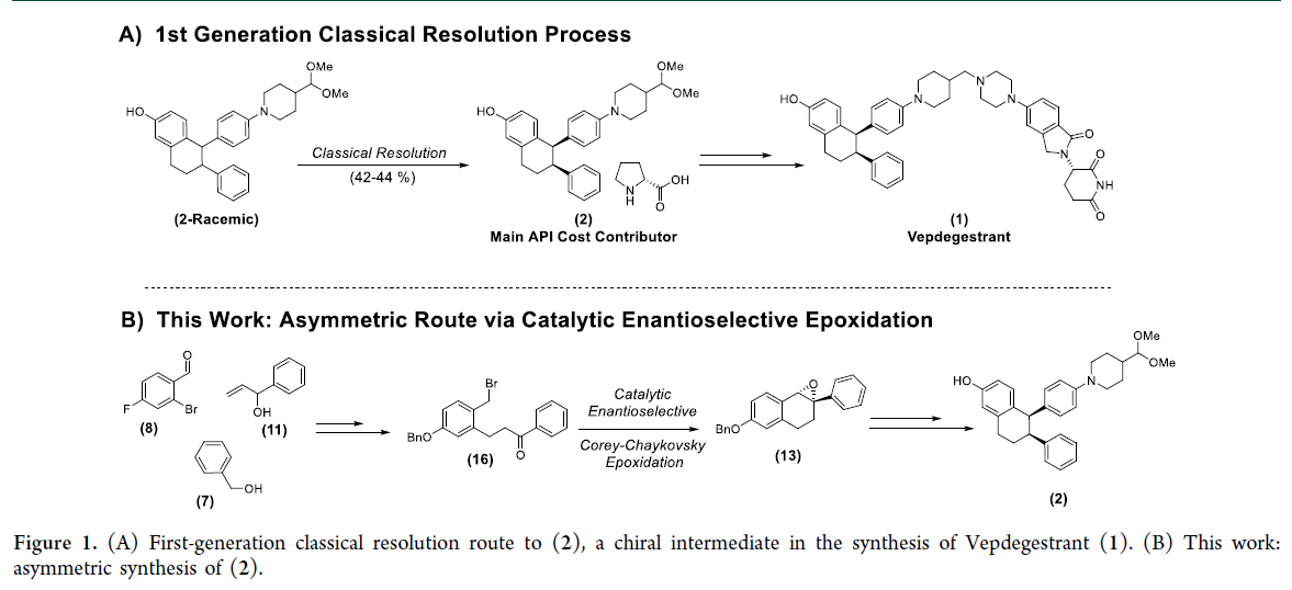 目前,Vepdegestrant(1)现行商业化路线以消旋体(rac)-2为中间体,依赖后期经典拆分实现cis-1,2-二芳基结构的对映体纯化,进而导致关键中间体(2)损失超50%(Figure 1),显著推高API成本。拆分策略在产能和成本上均不可持续,亟需简洁、可放大的不对称合成路径。