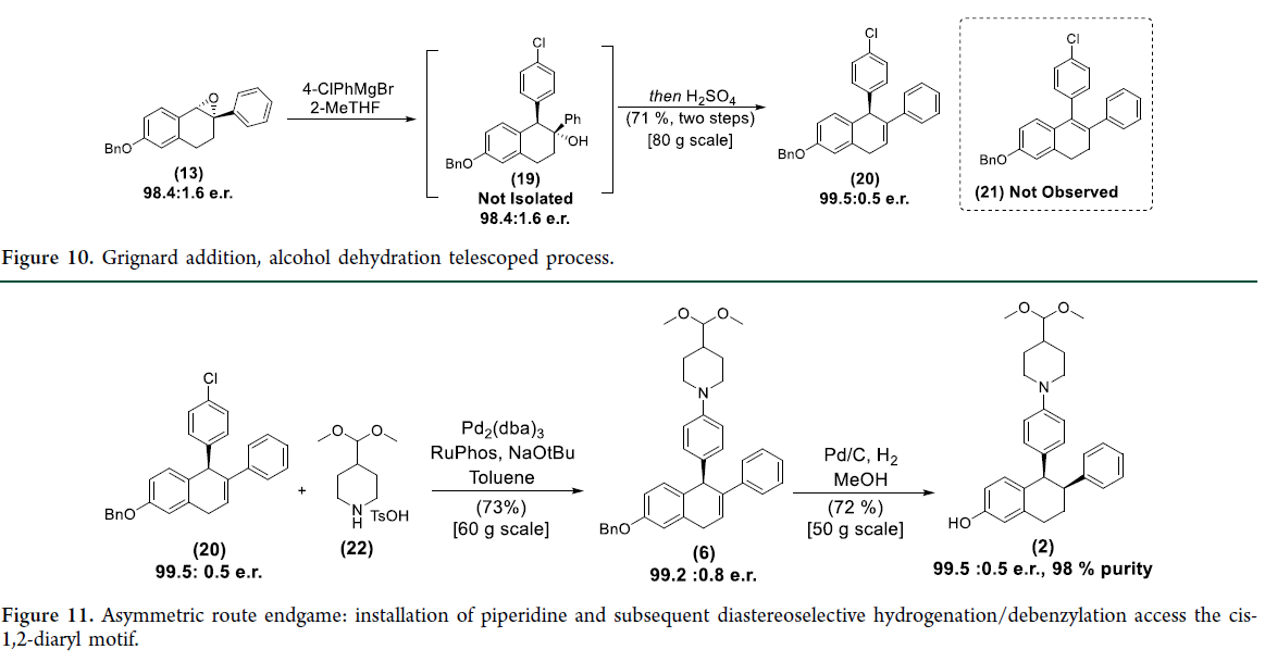 综上,辉瑞的科学家,利用不对称的分子内Corey-Chaykovsky 环氧化反应引入手性源,在经环氧化物开环/水解串联、C–N偶联和底物控制的非对映选择性氢化等,成功实现cis-1,2-diaryltetralin中间体2的不对称合成,进而避免目前用于制备(2)的经典拆分过程。