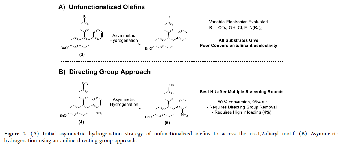 首先,辉瑞的科学家以四取代烯烃(3)(Figure 2A)作为原料,利用不对称氢化以构建cis-1,2-二芳基结构。其中,该策略受Pfaltz团队开创性工作的启发,其N,P-配位铱催化剂可高效氢化多种无官能团四取代烯烃;但二氢萘类底物被明确列为难点:反应缓慢且易发生芳香化副反应。此外,Časar组虽曾用类似Ir催化剂氢化简化版1,2-二芳基lasofoxifene前体,但ee值中等,且催化剂用量高、反应时间长,不具工艺可行性。