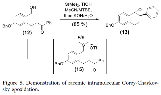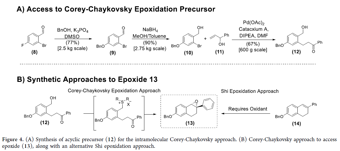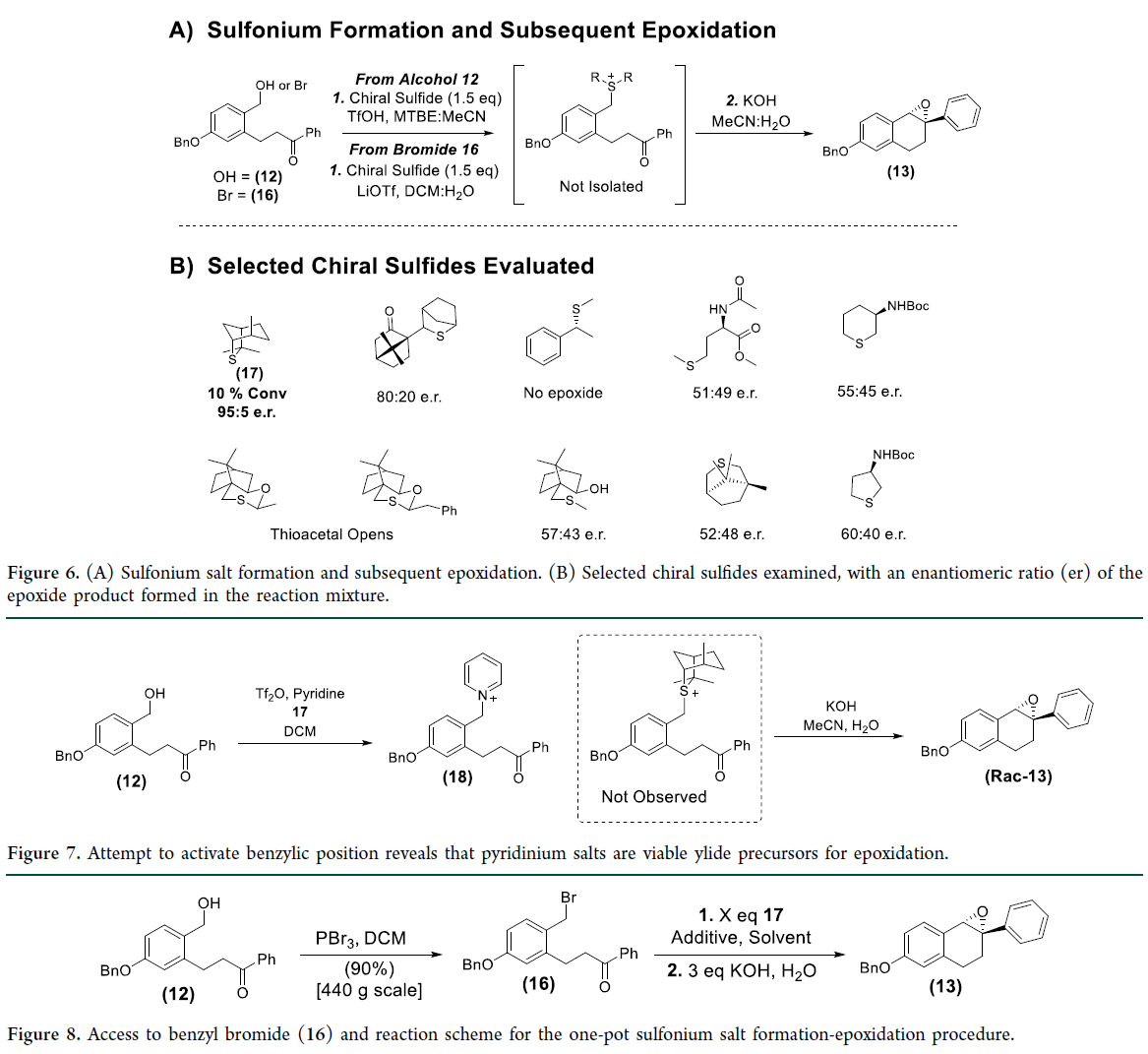 其次,利用手性γ-二氢萘(6)作为原料经非对映选择性氢化,并借首芳基的空间屏蔽实现烯烃单面加氢,立体传递构建cis-1,2-二芳基结构。然而,构建(6)的尝试均受限于首芳基的不对称引入及芳构化副反应,终未达预期。最终路线摒弃传统加氢思路,采用催化、对映选择性分子内Corey–Chaykovsky环氧化,由无环前体一步构筑四氢萘核心。即苄醇(7)与氟代醛(8)的SNAr反应获得(9)(77% yield,2.5 kg 规模,Figure 4A)。(9)经NaBH₄还原后结晶得苄醇(10)(90% yield)。随后,(10)与烯丙醇(11)(苯甲醛+乙烯基溴化镁,一锅制备)发生钯催化Heck反应获得(12)(67% yield,600 g 规模)。(12)采用硫叶立德介导的Corey–Chaykovsky环氧化(Figure 4B),无需外源氧化剂即可高效构建环氧化物(rac-13)。其中,环氧化关键在于苄基锍盐(15)的构建:(12)在0 °C下与CF₃SO₃H/Me₂S于CH₃CN:t-BuOMe中反应,快速、洁净生成(15);甲磺酸或硫酸亦可行,但速率略缓。粗品经溶剂置换(CH₃CN:H₂O = 9:1)后,KOH处理原位生成锍叶立德,直接结晶得外消旋环氧化物(rac–13)(Figure 5)。此结果验证该环氧化路径的可行性,为后续不对称版本奠定基础。