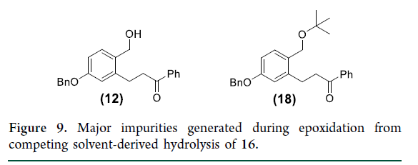 为强化两相反应效率,引入TBAI,其轻微提升反应速率(entres 9–10)。无论是(17)的用量如何,环氧化严格依赖(17)衍生的手性锍叶立德中间体,故所有条件下活性物种相同。杂质分析显示,主要副产物为(16)经水或t-BuOH水解生成的(12)与(18),二者均不参与环氧化(Figure 9)。尝试非亲核溶剂反而恶化反应。最终,通过深度浓缩体系并严控H₂O/t-BuOH含量,水解被有效抑制,转化率达85%(entry 12)。在最优条件下完成120 g级放大(entry 13):(13)经i-PrOH/CH₃CN重结晶,以68% yield、98.4:1.6 er获得,结晶同步实现杂质清除与对映体纯度升级。