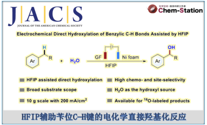 JACS:HFIP辅助苄位C−H键的电化学直接羟基化反应