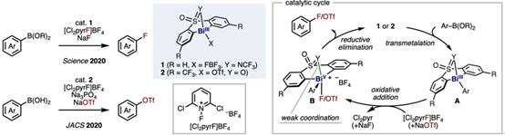 Josep Cornella教授建立了BiIII/BiV氧化还原催化循环,实现了芳基硼酸酯的氟化和三氟甲磺酰化。即铋催化剂1、2,6-二氯-1-氟吡啶盐([Cl2pyrF]BF4)和NaF体系下实现了芳基硼酸酯的氟化。其反应机理:1与芳基硼酸酯经转金属化生成芳基BiIII中间体A。随后,[Cl2pyrF]BF4对A发生氧化加成生成阳离子型BiV中间体B,再经还原消除得到氟代芳烃并再生催化剂1。该循环的关键在于:(1)采用易于发生氧化加成的氟吡啶盐;(2)配体中磺酰亚胺的氮原子弱配位稳定阳离子型BiV中间体B。此外,BiIII催化剂2与NaOTf作用下,还可实现芳基硼酸酯的三氟甲磺酰化。