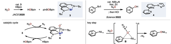 一氧化二氮(N2O)是一种具有显著温室效应的有害气体,其全球增温潜势超过二氧化碳的300倍。近年来,已有研究提出将N2O作为潜在氧源加以资源化利用的策略。例如,在铋催化剂3的存在下,于N2O气氛中与HBpin发生反应,可实现氧原子对H—B键的插入,从而生成HOBpin。该过程可能通过催化剂3与N2O作用生成BiIII–oxo中间体A,随后被HBpin还原并释放氧原子的机理进行。此外,研究还发现,在含有自主设计的三齿配体4的镍催化体系中,结合NaI与锌还原剂,可实现由溴代或碘代烯烃出发合成酚类化合物。此转化可能涉及烷基镍物种与N2O反应,经由类似Baeyer–Villiger氧化的过渡态B,实现氧原子对烷基–镍键的插入。