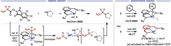 除上述体系外,铋催化剂还展现出其他独特反应特性。例如,在红光照射下,催化剂3与碘代芳烃发生氧化加成。该过程的关键在于光照诱导的金属到配体电荷转移(MLCT),即电子从BiI中心向配体转移,从而生成具有强还原能力的BiII•+活性物种。