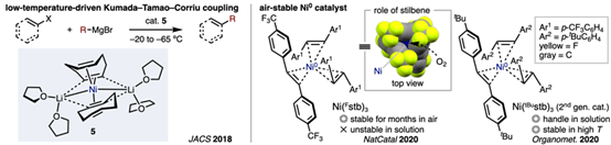 Josep Cornella教授发现了低价镍和烯烃配体组合的新型催化剂。如催化剂5在极低的温度下实现Kumada coupling。另外一方面,研究发现,含三个1,2-bis(4-(trifluoromethyl)phenyl)ethene配位的零价镍络合物(Ni(Fstb)3)可在空气中可稳定存在数天。X射线晶体结构分析表明,该稳定性源于苯乙烯配体以垂直于镍中心配位平面的方式排列,从而有效阻碍了氧分子的接近。尽管该催化剂具有优异的空气稳定性,其在现有反应中的催化活性仍可与Ni(cod)2相媲美。此外,将三氟甲基(CF3)替换为叔丁基(tBu)所得的第二代催化剂Ni(tBustb)3在溶液状态及高温条件下亦表现出良好的稳定性。上述试剂目前已由Strem Chemicals公司商业化供应。